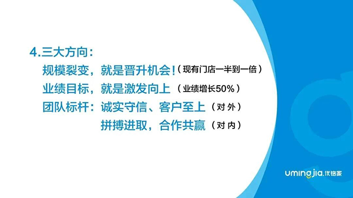 第二个方向,业绩目标。我认为一家公司如果定第二年的战略目标,至少要以增长30%为底线,然后挑战超越50%;如果公司业绩增长了50%,同比所有业务人员的收入也会增长50%,那么这家公司的业绩、公司的发展是非常良性的。离开业绩,大家是活不下去的。