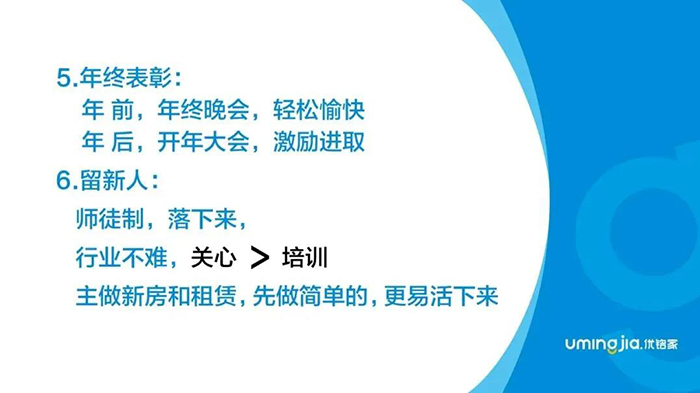 关于师徒制,因为平台都在提倡,各家公司也在做,但有没有真正把它落下来,对这个事对留新人是非常重要的,尤其是新人,这个行业相对比较复杂,所以我们建议新人从做租赁、做新房开始。越容易做的事儿,反而越容易让他留下。