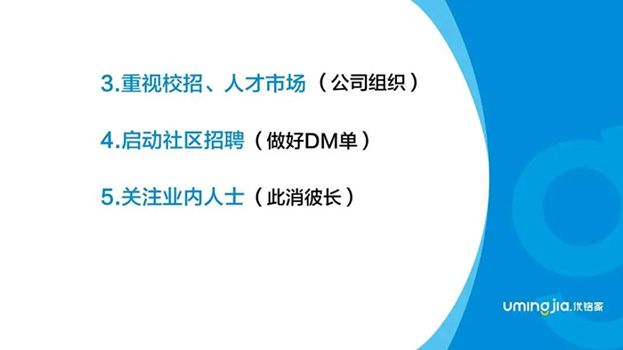 所以如果大家做好社区招聘,公司层面要做好DM单。员工只愿意干简单的事,去招聘手里什么东西也没有,这是问题。包括门店的招聘海报、社区活动等,都需要组织上来辅助做一些工作,才能让业务团队真正在社区招到人;而且我认为现阶段,小公司招聘条件其实不要太苛刻。