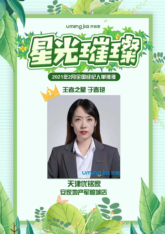 2021年2月,天津优铭家经纪人于春艳以成交5单买卖房源的成绩,在“星光璀璨”计划全国王者之星单量经纪人排名中并列第一。作为一名刚入行半年多的新人,于春艳可谓是超速成长,成绩斐然。