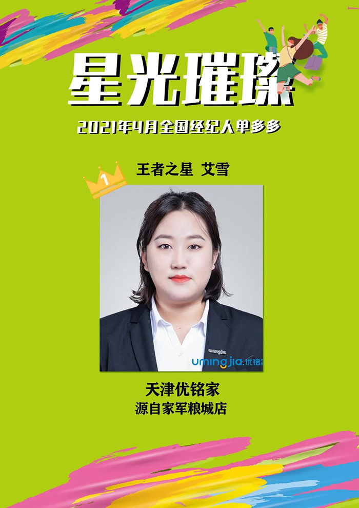 如今,艾雪踏入社会不到两年时间,随着门店加盟优铭家刚满一年,自身已经发生了许多美好的转变,并成为了2021年4月全国王者之星单量TOP1经纪人。艾雪说:“我性格内向,记忆力与接受能力也不够好,但是通过这个行业自己顺利融合到了社会中,因为在这里,只要你用心干,好的结果就一定会来!”